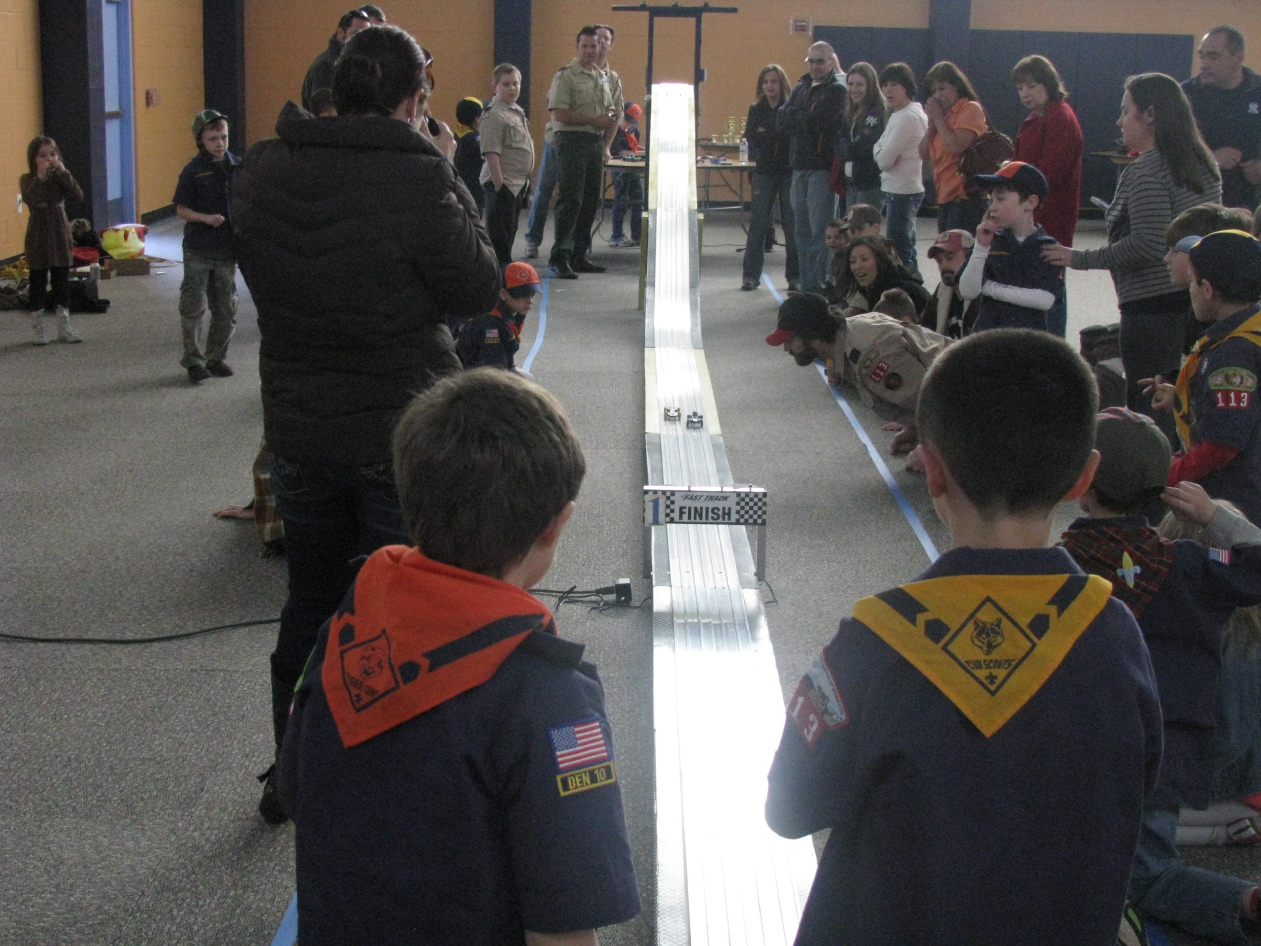 The Cun Scout Troop 113 gathered at the Adam Bucky James Community Center to participate in the Pinewood Derby Championship. The scouts were excited as they watched the race cars that they designed battle to win.