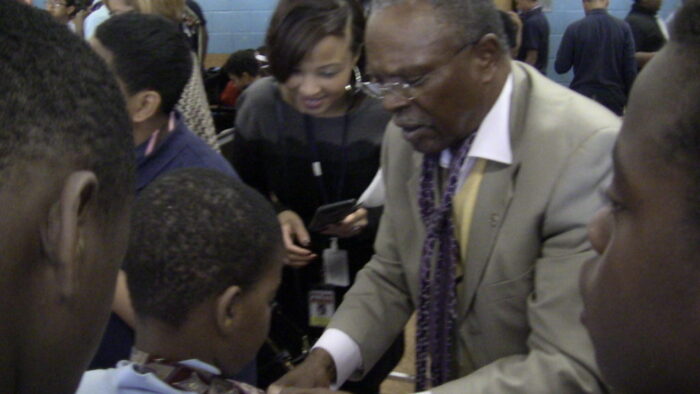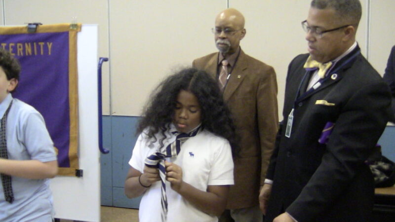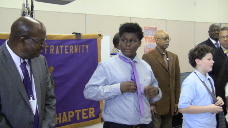 Educator and Omega Psi Phi Fraternity member Gerald Glisson teaches an Asbury Park Middle School student how to tie a tie