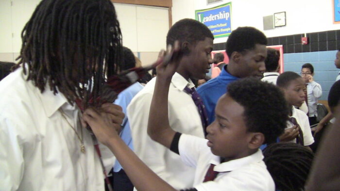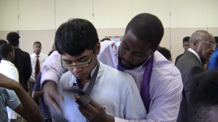 - Student helping another tie a tie