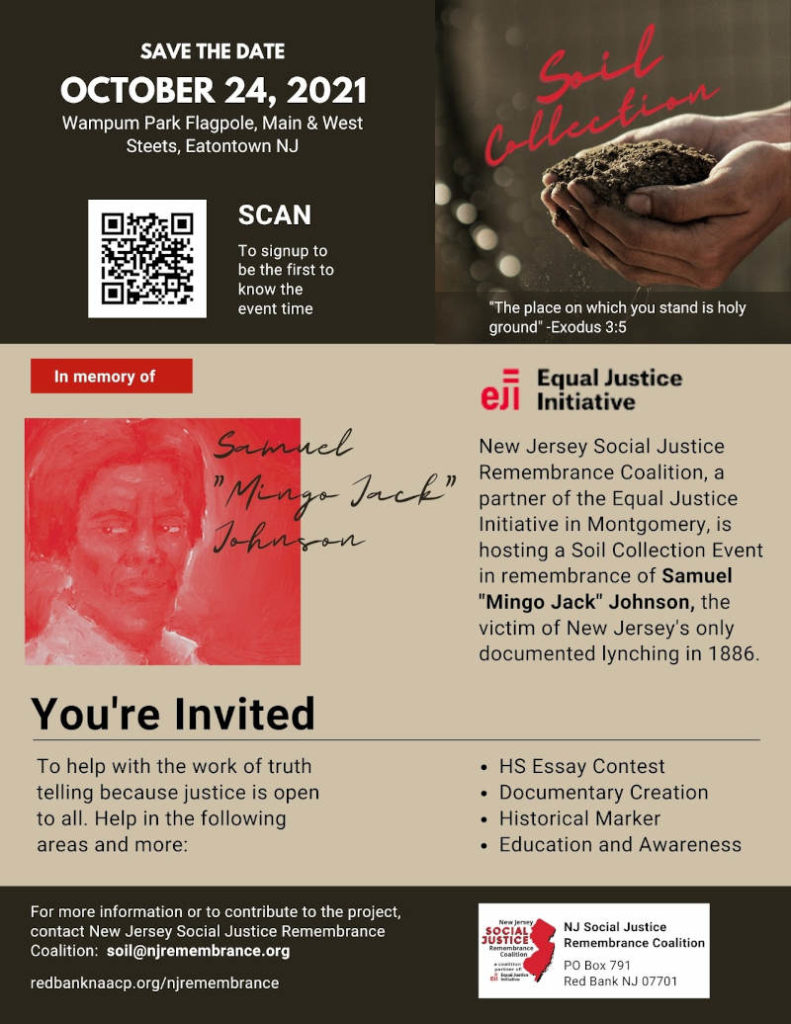 The New Jersey Social Justice Remembrance Coalition in partnership with the Equal Justice Initiative (EJI) is preparing for the Soil Collection ceremony at Wampum Park, in Eatontown, on Oct. 24 at 3 pm, where Samuel “Mingo” Jack Johnson was lynched.